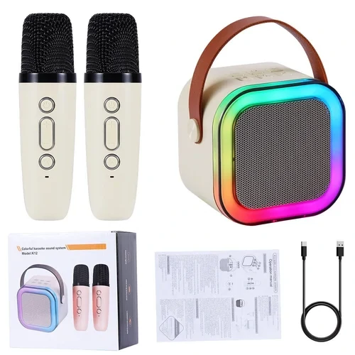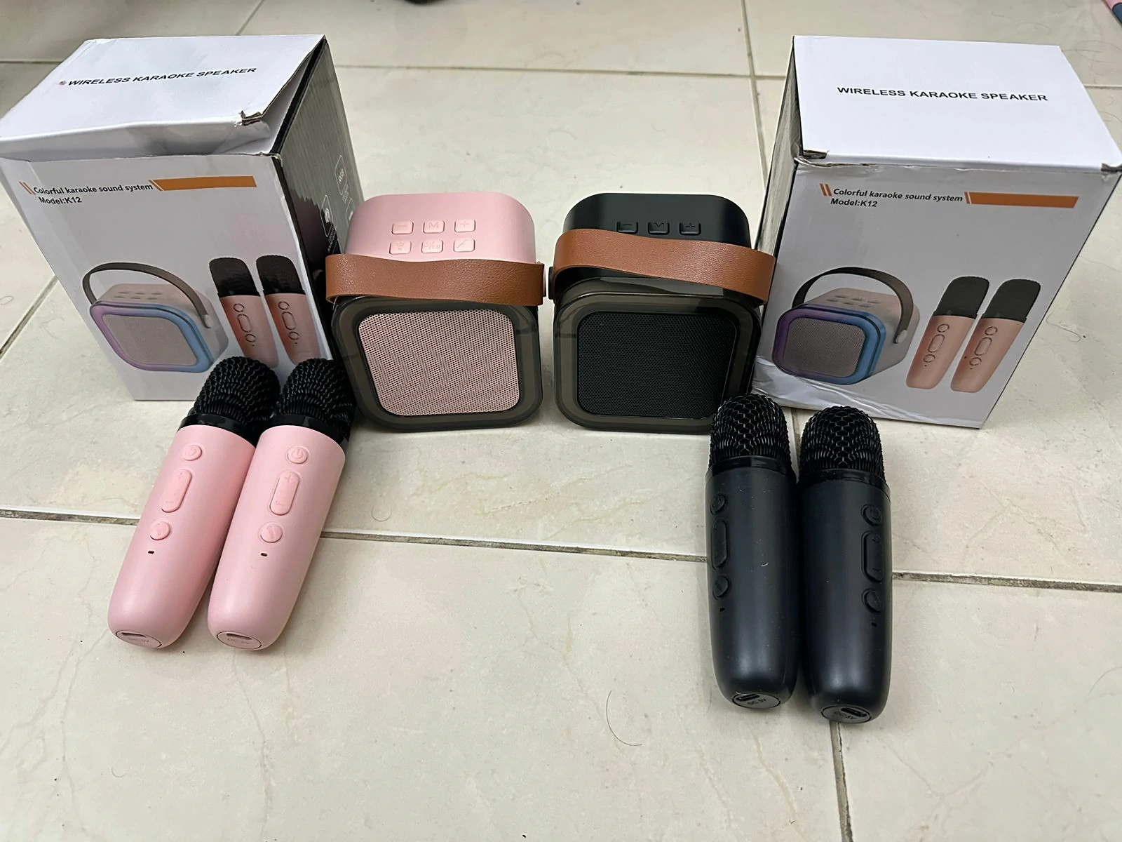 Karaoke speaker with 2 wireless microphones. Rechargeable and can connect with any phone or other device. Best for the party.